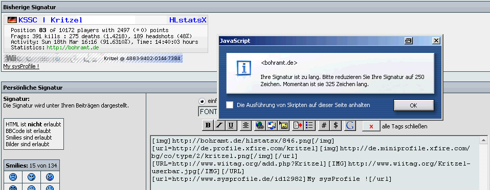 Auch wenns klasse ist, dass man jetzt ne Menge Bilder in die Signatur hauen kann, würd ich Euch bitten, dabei die Tiefe im Auge zu beachten - find es ein klein wenig nervig, immer an manchen riesen-Signaturen vorbei scrollen zu müssen, um endlich zum nächsten Beitrag zu kommen. Wenn man das wie Bjoern kompakt verpackt, ist das weniger ein Problem. Des weiteren erhöht das die Ladezeiten von Leuten mit langsam Verbindungen (wie mir aktuell ^^) und auch das stört auf die Dauer.
