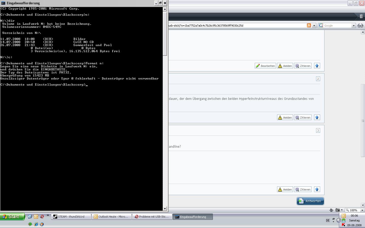 Hab es jetzt schon unter WinXP normal mit formatieren versucht, mit externen Programmen, unter der Eingabeaufforderung und jedesmal bekomm ich ne Fehlermeldung, dass er den Stick nicht formatieren kann.