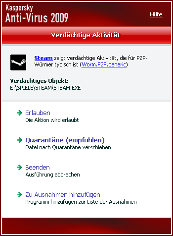 hatte gerade ein wenig ärger mit Steam, habe drauf hin Log/Blob-Files gelöscht. Einen "Neustart" von Steam qutierte Kaspersky daraufhin mit eine Wurmwarnung :baby:.