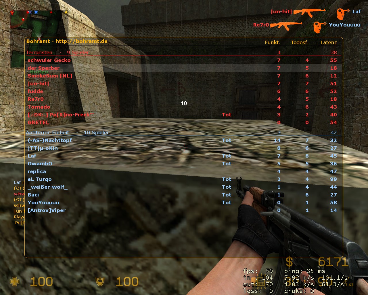 heute um 13:10 war der Cheater mit Speedhack auf dem Server unterwegs. Zeugen: Un-Hit, Okin, Fudde und Owambo.