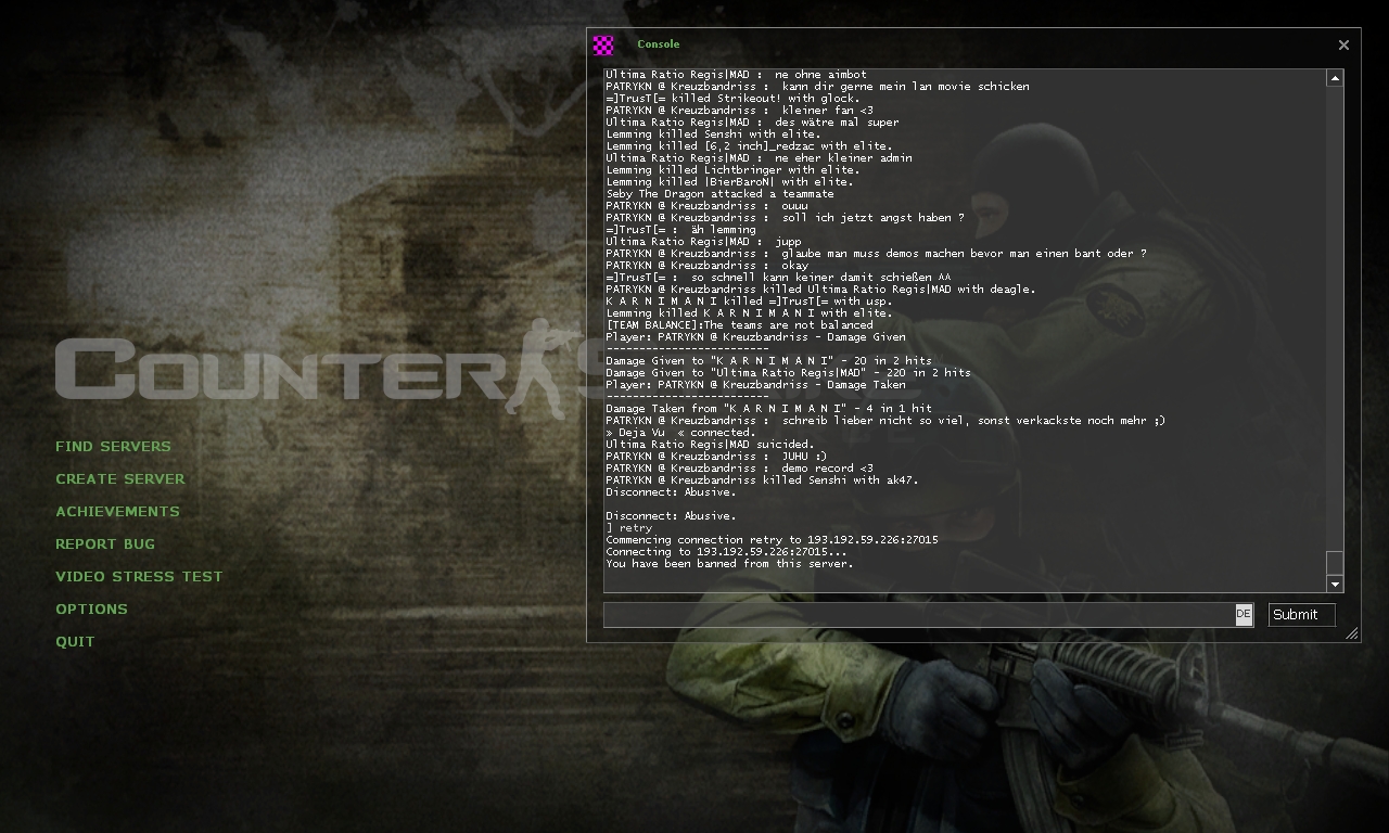 Jetzt wurde ich gebant von einem Admin der sich nicht richtig an die Regeln gehalten hat. Dieser hat mir gedroht ich sollte mein Aimbot aus machen, obwohl ich natürlich keinen habe. Danach habe ich ihm geschrieben das er nicht so viel schreiben soll, sondern sich mal lieber auf das Spiel konzentrieren soll, sonst würde er noch mehr losen ( Was jedem klar ist ) Und dazu habe ich dann auch noch geschrieben das er von mir eine Demo braucht um überhaupt Beweise zu haben, obwohl es natürlich keinen geben kann / wird / sollte.